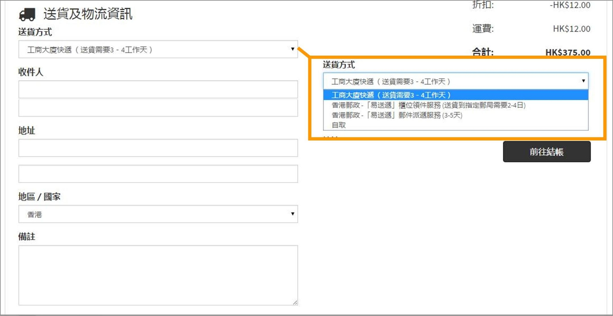 送貨方式:請參考 [送貨收費] 頁面,選擇最合適閣下之送貨方式。