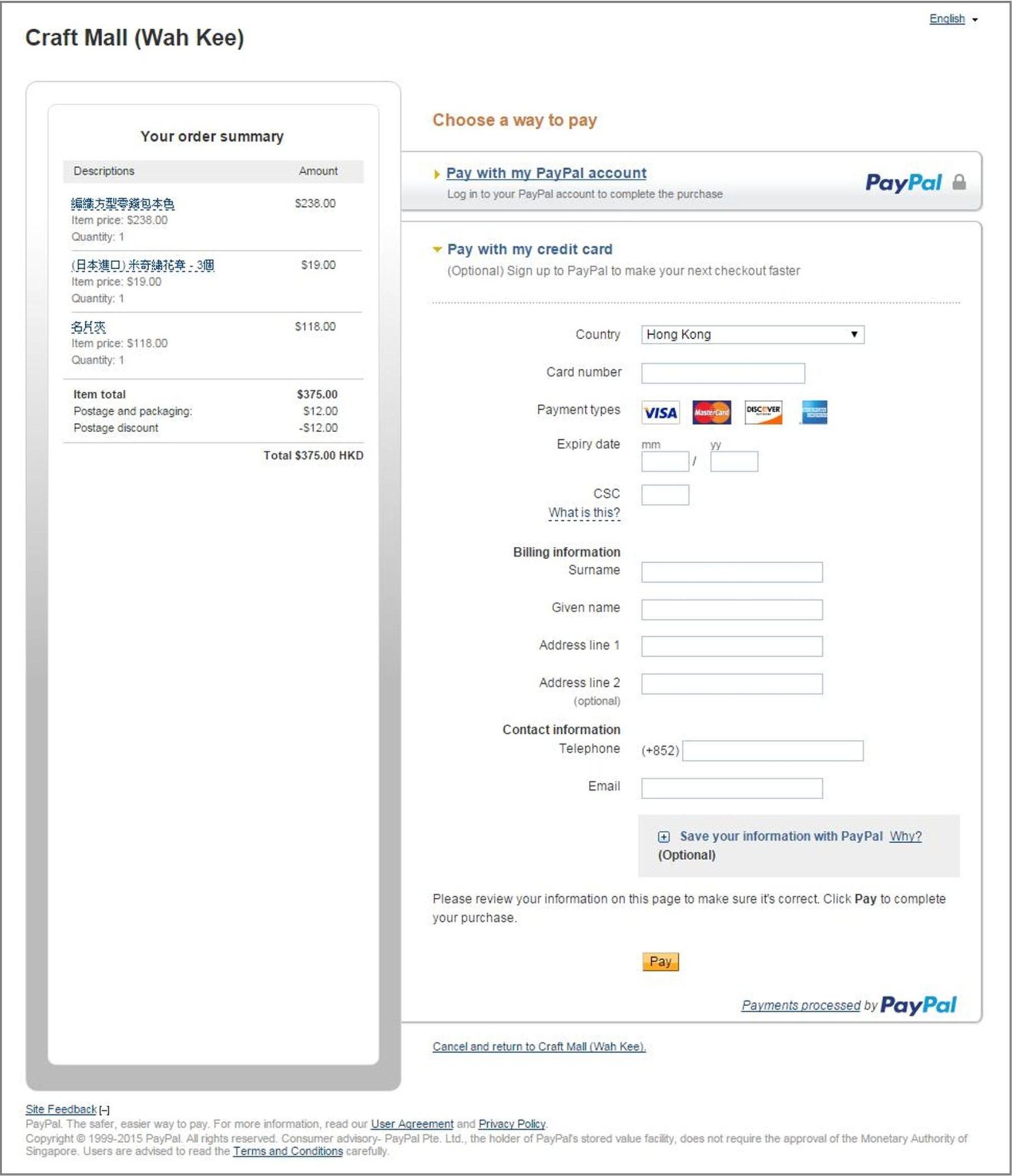 PayPal:輸入信用咭資料及簡單帳單資料,按 [Pay],付款完成。PayPal會以電郵送出付款詳情。
